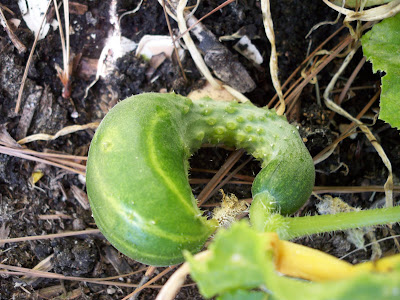 Finally, the cucumbers are looking WEIRD. They're curling as they grow, and this one is half developed (see picture). I have no idea what this means. None at all. Any ideas?